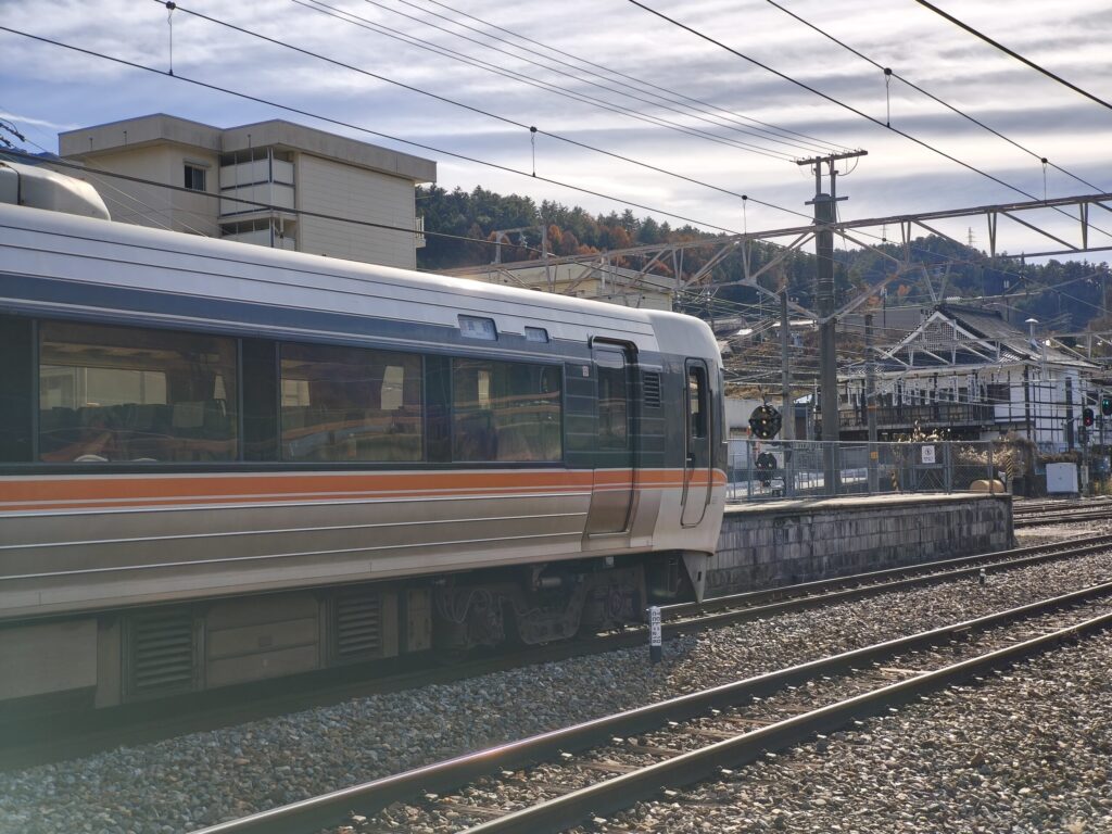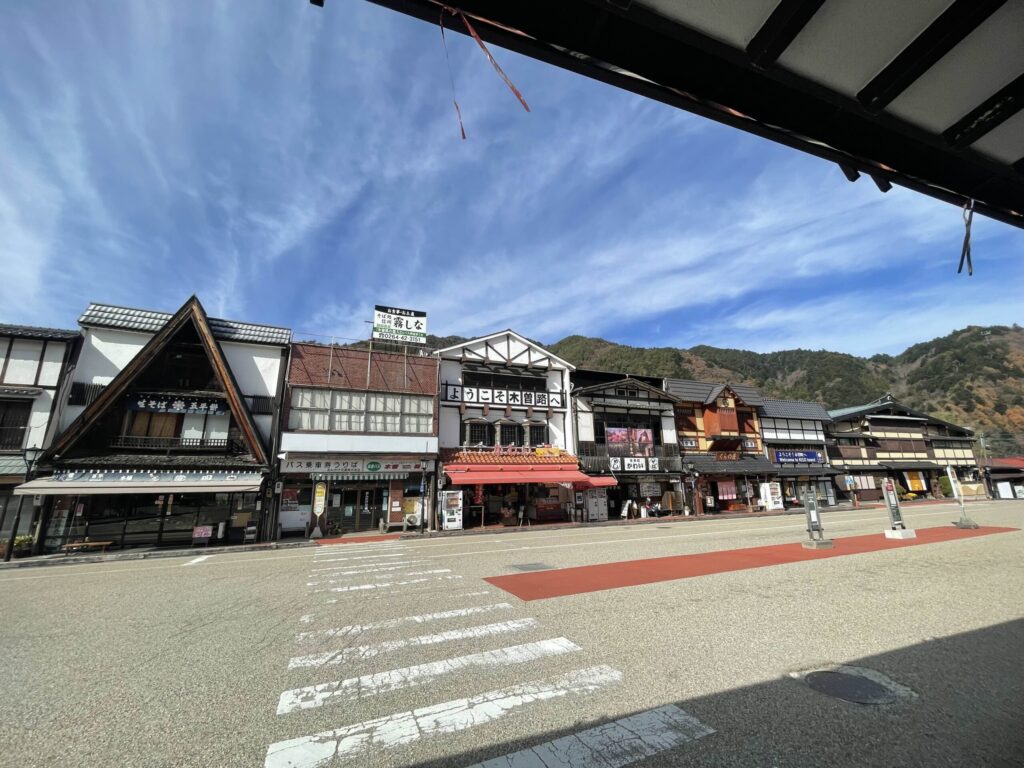 ドライブ中に見る景色を堪能してるうちに、第二目的地の木曽福島駅に到着。周りは昔ながらの温泉街のような街並みで、特急停車駅ということもあって、人の往来もそこそこあった。